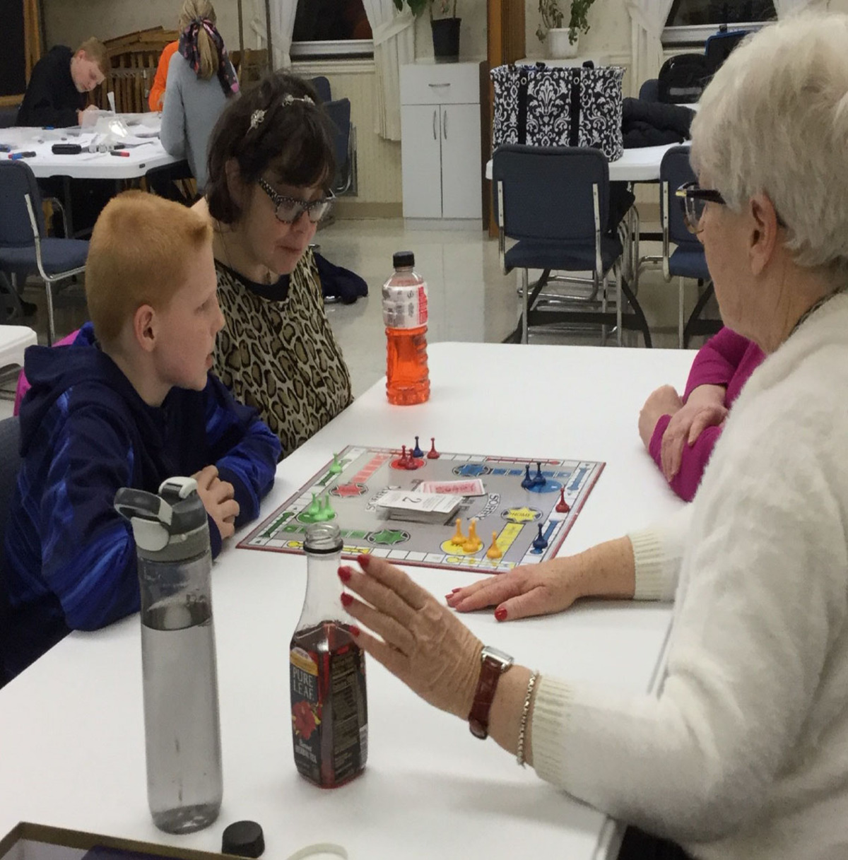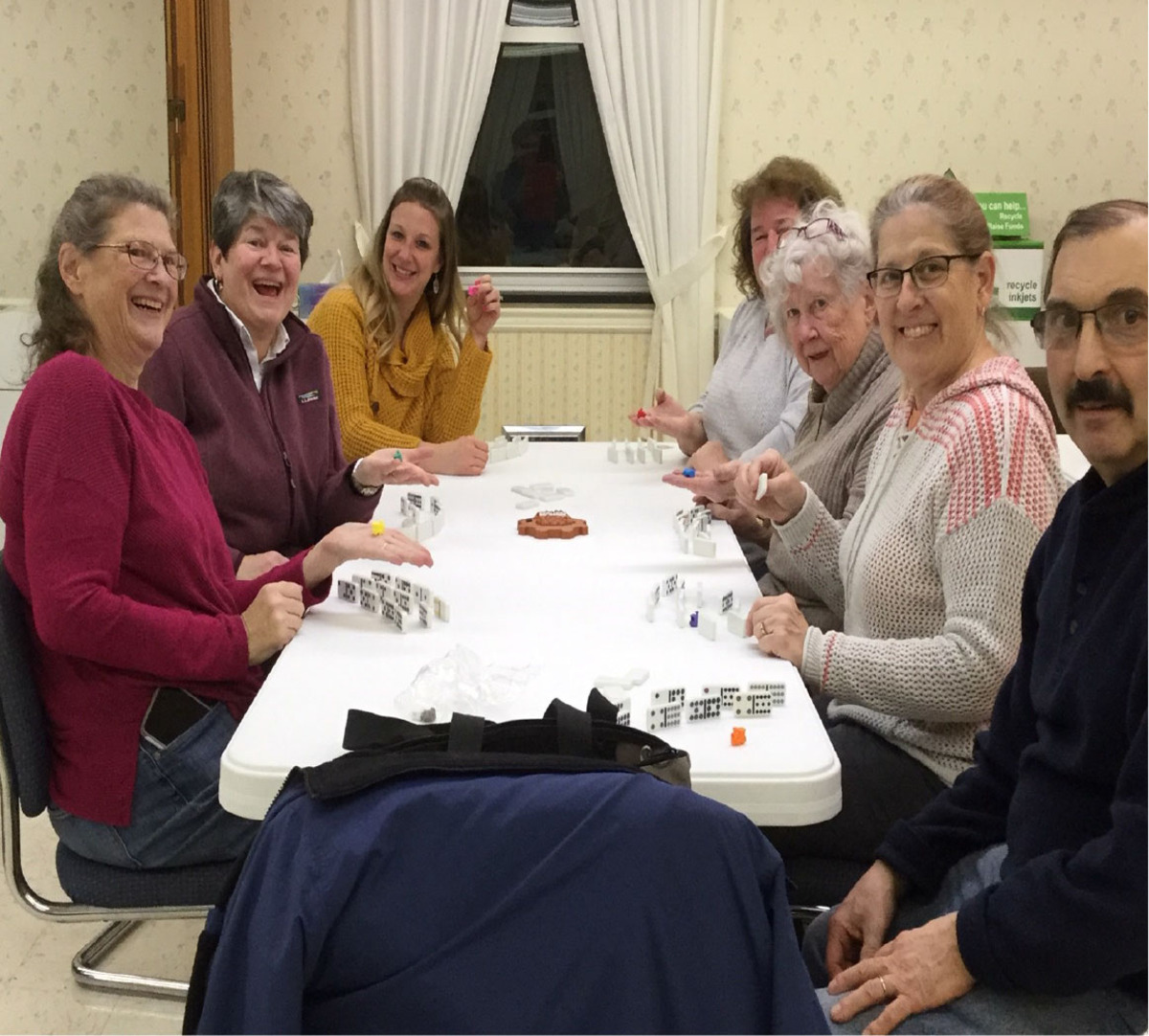 This group spent the evening playing Mexican Train. Pictured from left and proceeding clockwise: Louise Sackett, Pastor Melinda Artman, Amanda Mittan, Belinda Klovekorn, Linda Murrelle, Jeri Mullen and Frank Bottone.